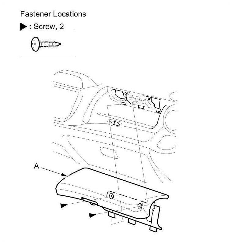 2. Remove the screws, then remove the passenger's upper tray lid (A).