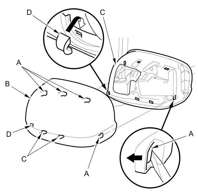 3. Release the hooks (C, D), then remove the mirror housing cover.