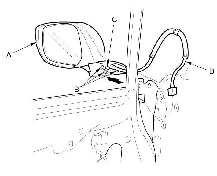 6. Remove the mirror (A) by pulling the threaded studs (B), the screw (C), and the wire harness (D) out through the holes in the door. Take care not to scratch the door or the mirror.