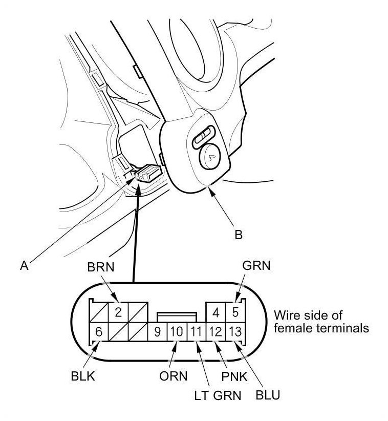 2. Disconnect the 13P connector (A) from the power mirror switch (B).