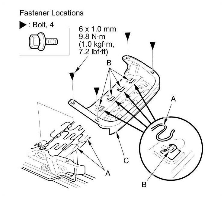 4. If necessary, remove the bolts, and release the seat cushion springs (A) from the hooks (B), then remove the seat cushion frame (C).