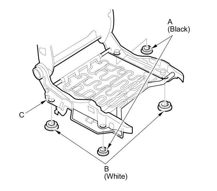 6. If necessary, remove the bushings (A, B) from the seat cushion frame (C).