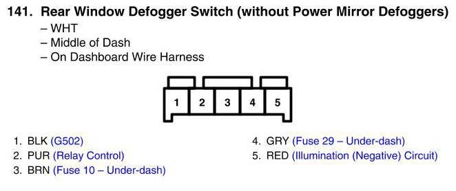 View 141 - Rear Window Defogger Switch Connector View (Without Power Mirror Defoggers)