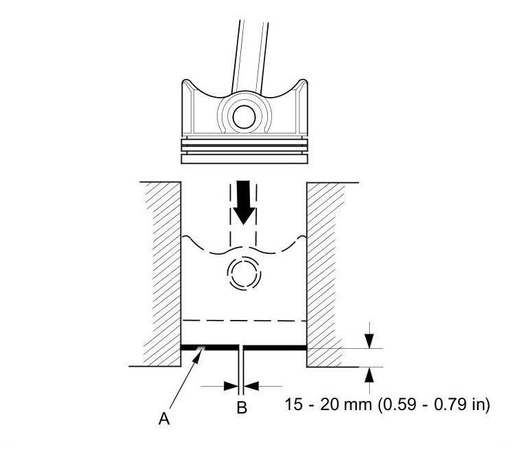 4. Using a piston, push a new ring (A) into the cylinder bore 15-20 mm (0.59-0.79 in) from the bottom.