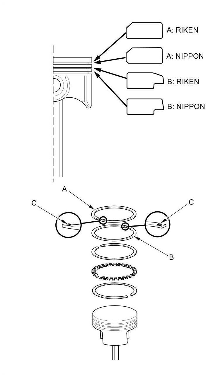 6. Install the rings as shown. The top ring (A) has a R or 1N mark, and the second ring (B) has a 2R or 2N mark. The manufacturing marks (C) must be facing upward.