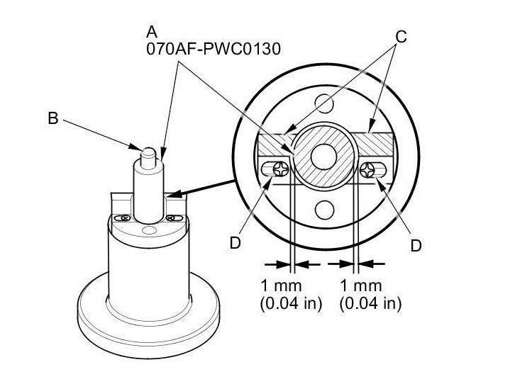 3. Temporarily install the pilot collar, O.D. 18 mm (A) over the pilot pin (B), and adjust the piston base head (C) as shown, then tighten the screws (D). Remove the pilot collar.