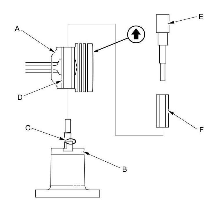 3. With the arrow on top of the piston and the embossed mark on the connecting rod facing up, place the piston/connecting rod assembly (B) on the piston base head (C). Be sure you position the recessed flat area of the piston against the area of the piston base head (D) as shown.