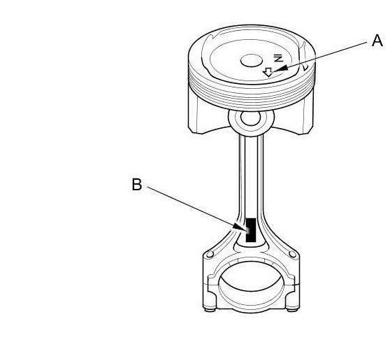 1. Assemble the piston and the connecting rod with the arrow (A) and the embossed mark (B) on the same side.