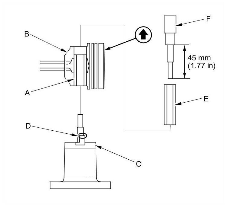 6. Press the piston pin (D) out with the adjustable piston pin driver head and insert adjust (E), the pilot collar (F), and a hydraulic press.