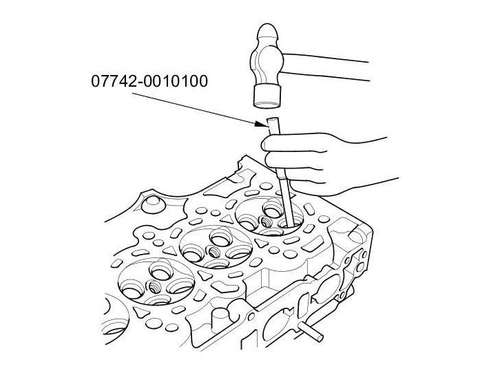 5. Working from the camshaft side, use the valve guide driver and an air hammer to drive the guide about 2 mm (0.08 in) towards the combustion chamber. This will knock off some of the carbon and make removal easier. Hold the air hammer directly in line with the valve guide to prevent damaging the driver. Wear safety goggles or a face shield.