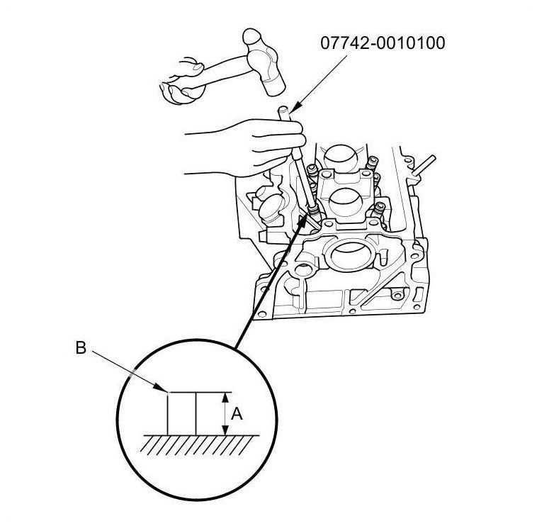 9. Apply a thin coat of new engine oil to the outside of a new valve guide. Install the valve guide from the camshaft side of the head; use the valve guide driver to drive the valve guide to the specified installed height (A) of the valve guide (B). If you have all 16 valve guides to do, you may have to reheat the head.