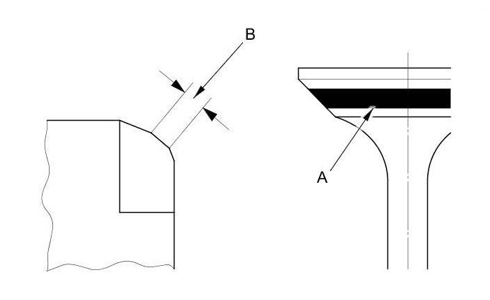 7. The actual valve seating surface (B), as shown by the blue compound, should be centered on the seat: