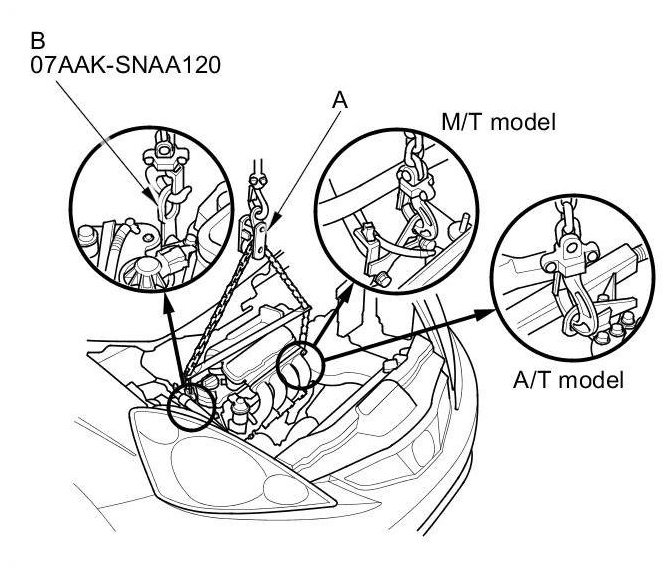 Be sure that they are properly aligned. Carefully lower the vehicle until the engine/transmission are properly positioned in the engine compartment. Make sure the vehicle is not resting on any part of the engine/transmission. Support the engine/transmission with a chain hoist (A) and the first universal lifting eyelet (B) and carefully raise the engine/transmission into place.