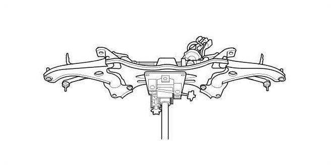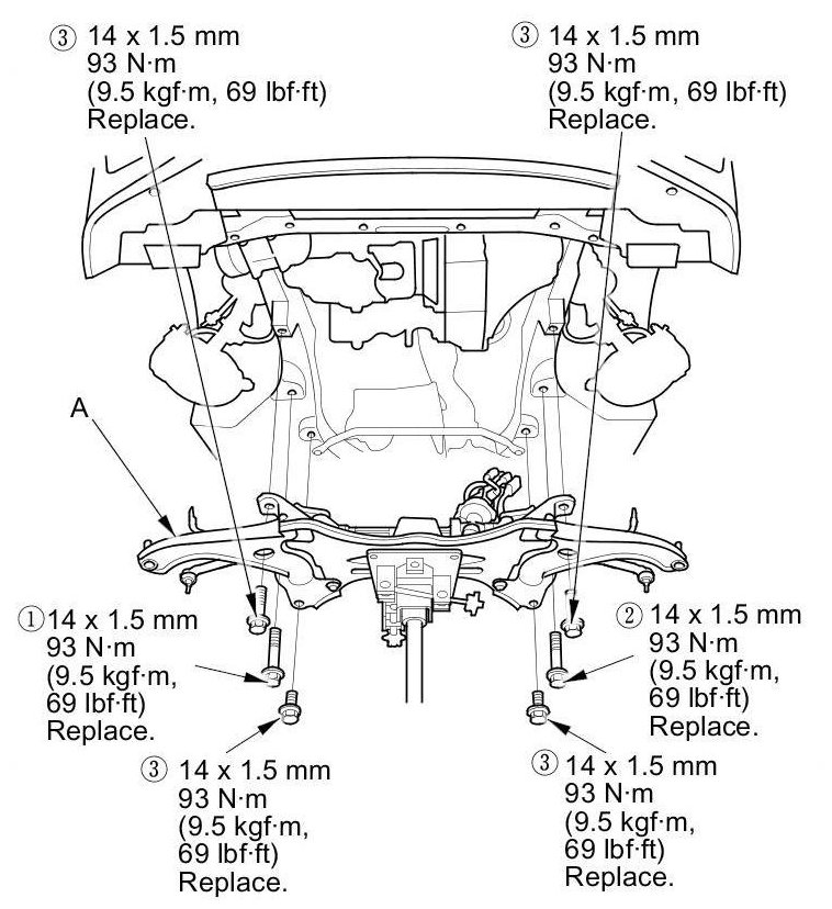 13. Install the front subframe (A), then loosely install the new front subframe mounting bolts.