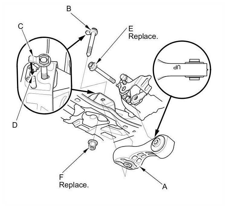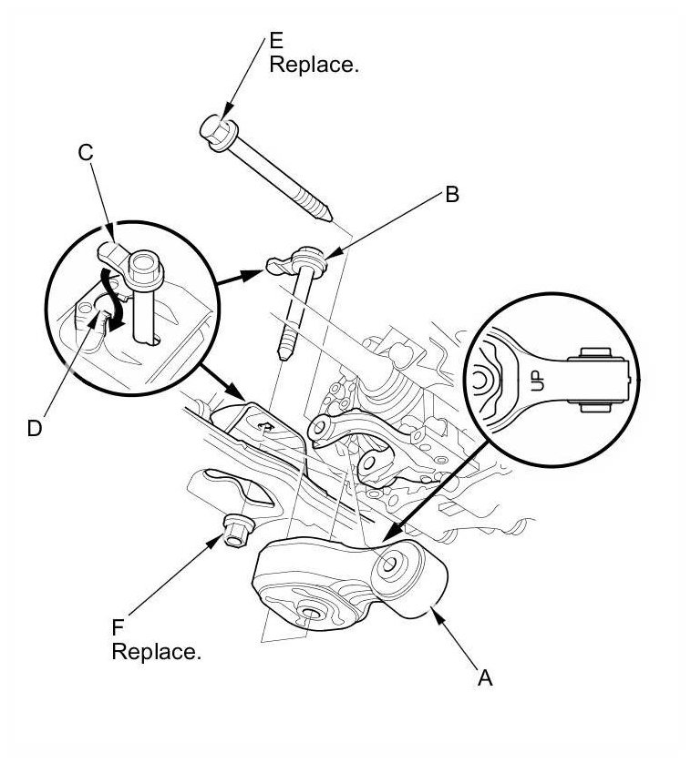 17. Install the torque rod (A). Install the bolt (B) with the tab (C) on the bolt head aligned with the guide (D) on the front subframe, then loosely install a new torque rod mounting bolt (E) and nut (F).