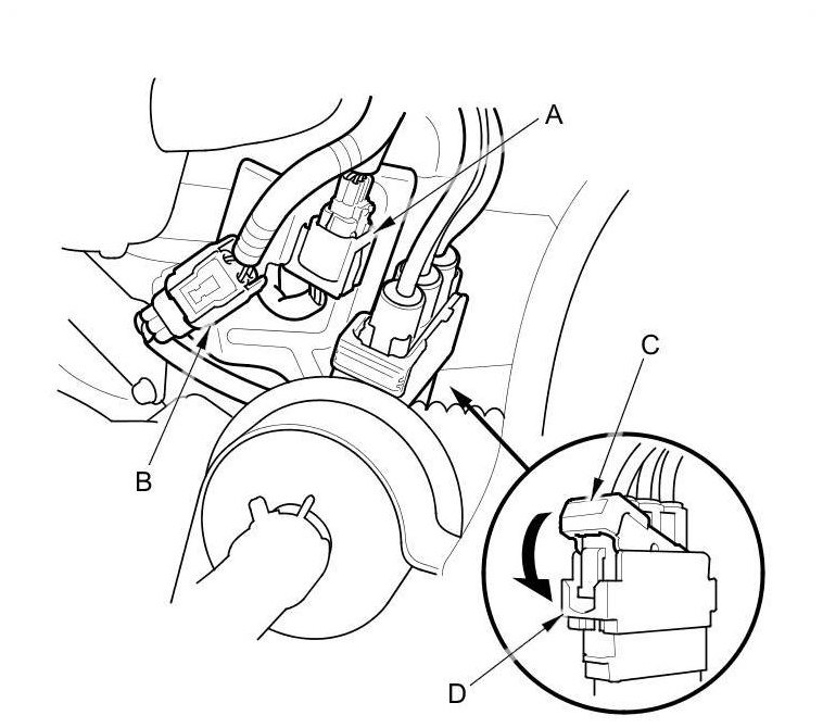 26. Pull down the lever (C) of the EPS motor 3P connector (D), then confirm the connector is fully seated.