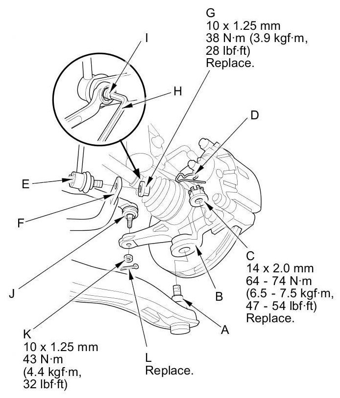 31. Install the tie-rod end ball joint (J) to the each knuckle with the nuts (K) and new cotter pins (L).