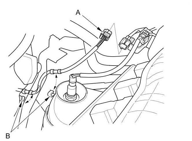 44. Connect the EVAP canister hose (A) and the brake booster vacuum hose (B).