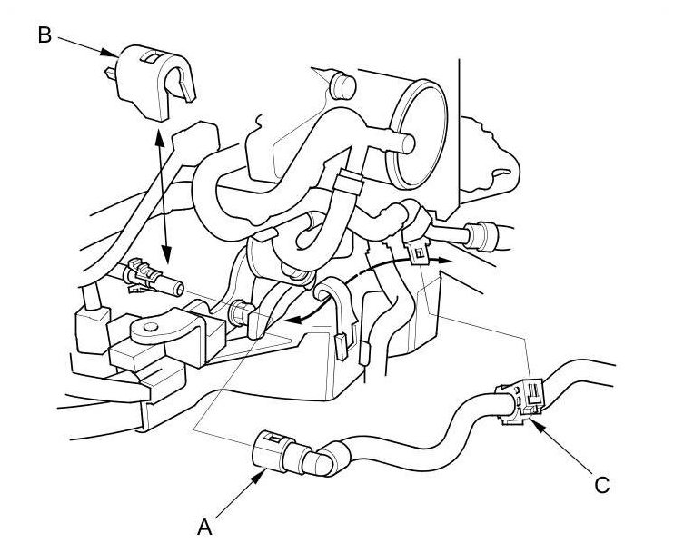 43. Connect the fuel feed hose (A) Fuel Line/Quick-Connect Fitting Installation, then install the quick-connect fitting cover (B) and the fuel feed hose clamp (C).