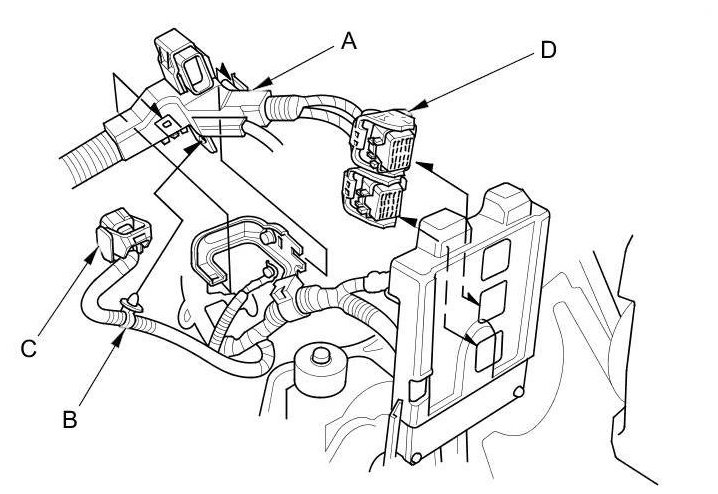 46. Connect the engine wire harness connector (C) and the ECM/PCM connectors (D).