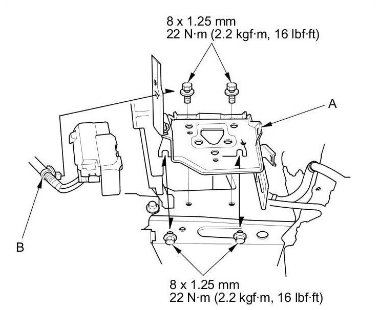 2. Install the side engine mount/bracket assembly (A), then tighten new side engine mount/bracket assembly mounting bolts (B).