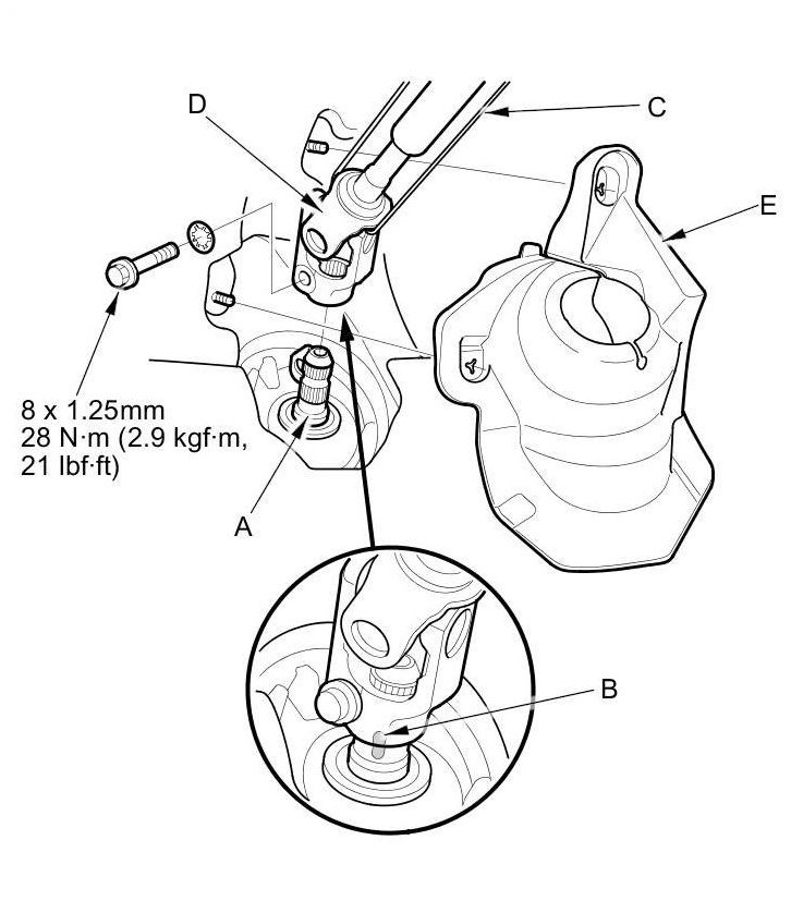 51. Connect the steering joint to the steering gearbox pinion shaft (A) by aligning the reference mark (B), then remove the wire (C) from the joint yoke (D).