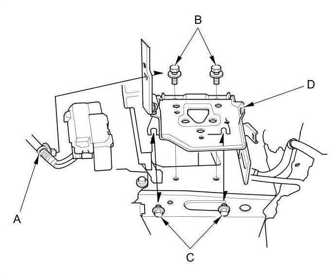 9. M/T model: Remove the harness clamp (A). Remove the two bolts (B) and loosen the two bolts (C), then remove the battery base (D).