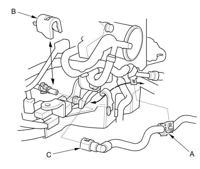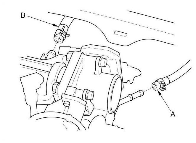 12. Disconnect the EVAP canister hose (A) and brake booster vacuum hose (B).