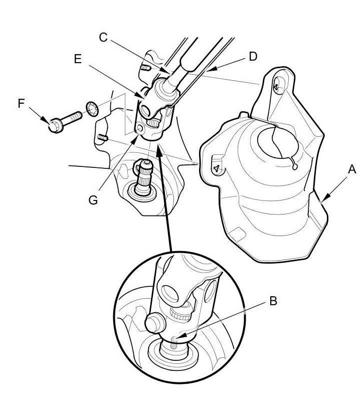 17. Make a reference mark (B) across the steering joint and the steering gearbox pinion shaft. Hold the slider shaft (C) on the column with a piece of wire (D) between the joint yoke (E) on the slider shaft to the joint yoke on the upper shaft. Remove the steering joint bolt (F), and disconnect the steering joint (G) by removing the steering joint toward the steering column.