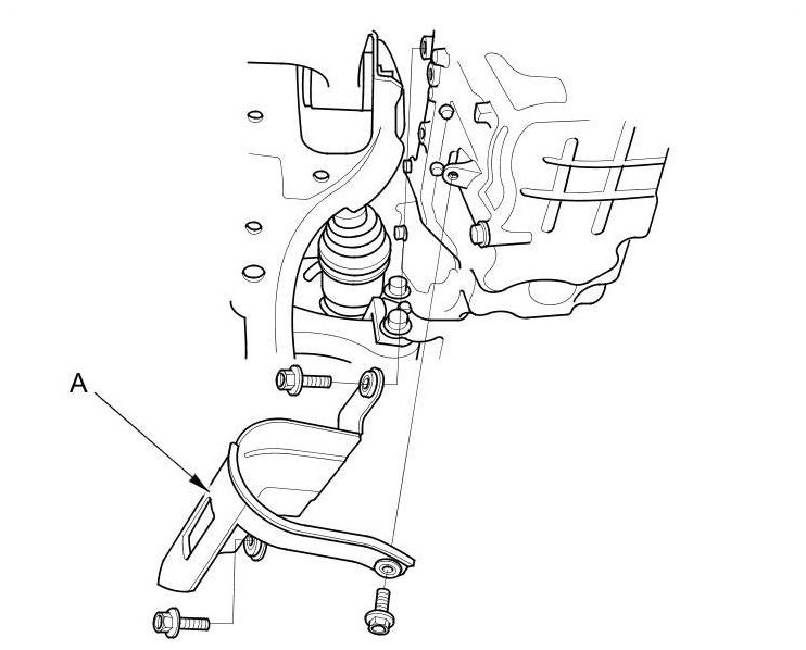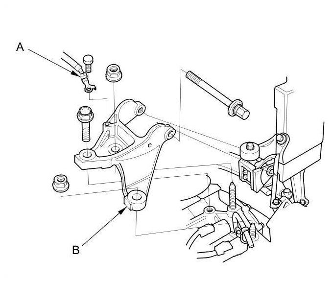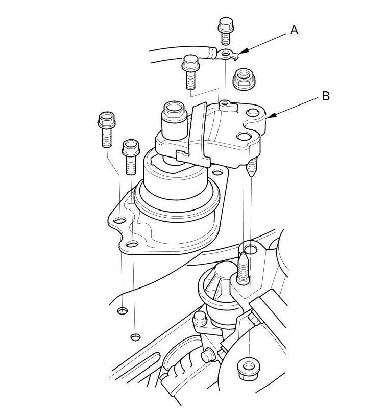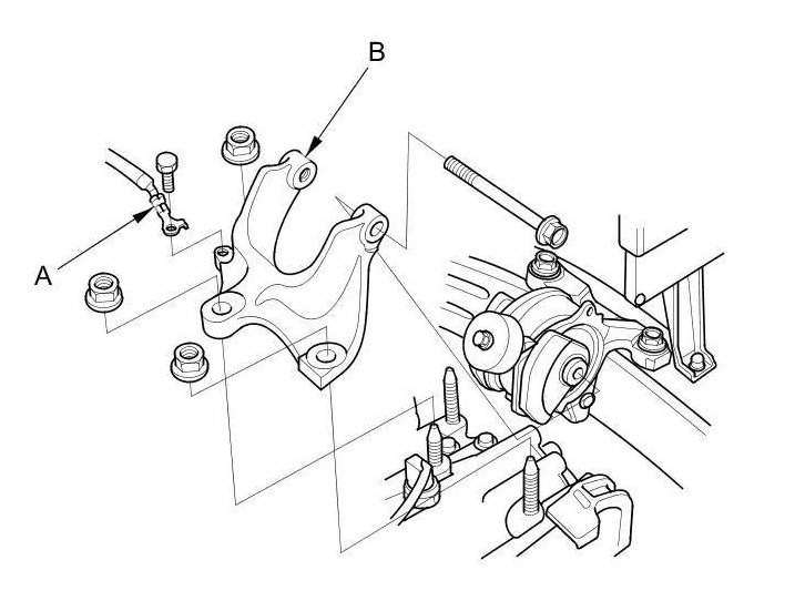 52. Remove the ground cable (A), then remove the transmission mount bracket (B).