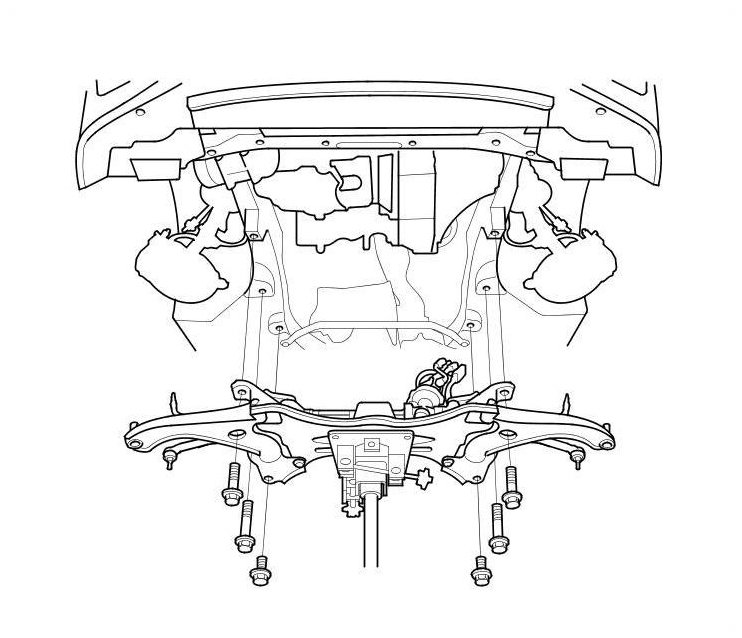 48. Lower the front subframe and the steering gearbox as an assembly by lowering the transmission jack slowly, then remove the assembly from under the vehicle.