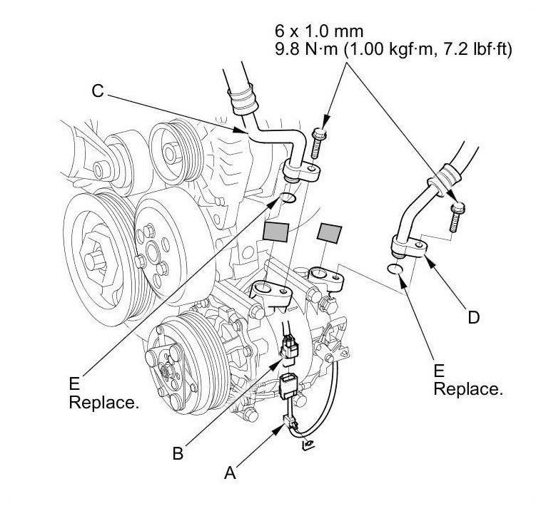 5. Remove the compressor clutch harness clump (A) from the condenser fan shroud, then disconnect the compressor clutch connector (B). Remove the bolts, then disconnect the suction line (C) and the discharge line (D) from the A/C compressor, and remove the O-rings (E). Plug or cap the lines immediately after disconnecting them to avoid moisture and dust contamination.