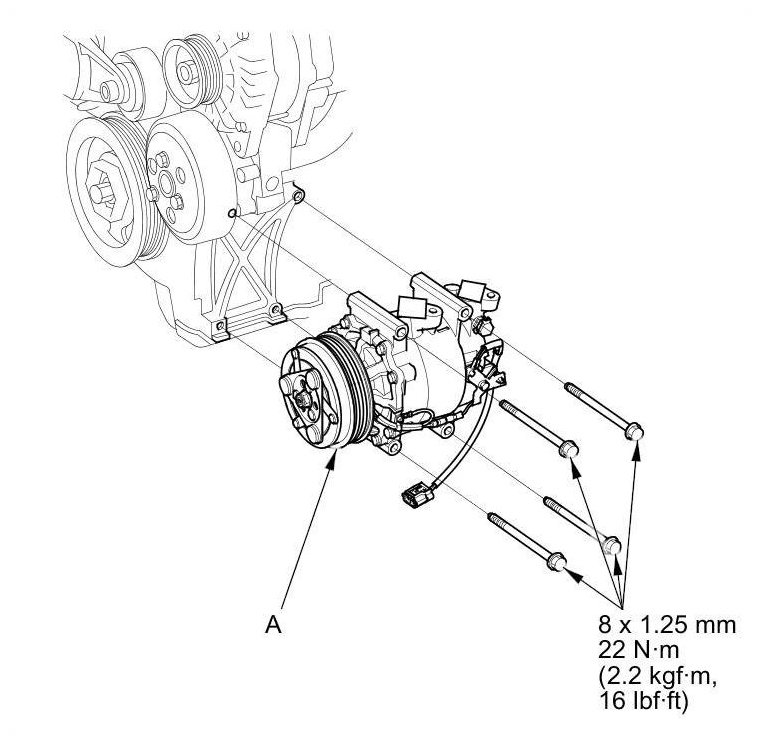 7. Install the A/C compressor in the reverse order of removal, and note these items: