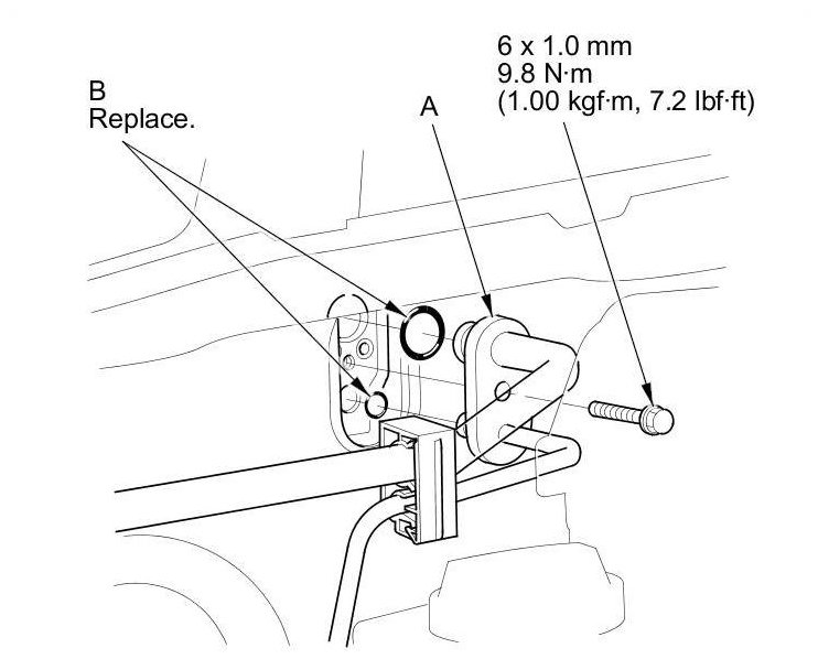 4. Remove the bolt, then disconnect the A/C line (A) from the evaporator core and remove the O-rings (B).