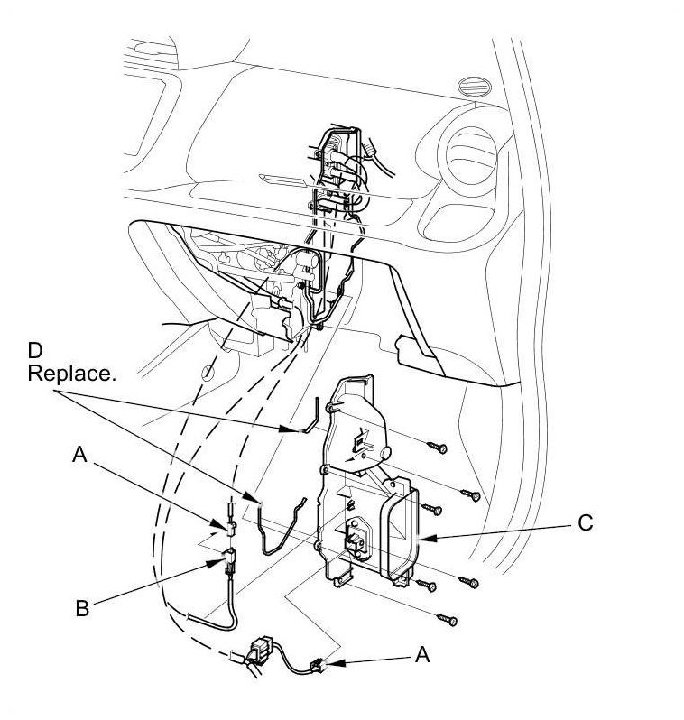 5. Disconnect the connectors (A) from the evaporator temperature sensor and the blower resistor, then remove the connector clip (B). Remove the self-tapping screws, the expansion valve cover (C), and the seals (D).