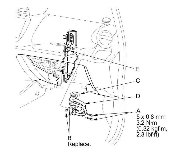 6. Remove the bolts (A), the O-rings (B), the expansion valve (C) and the inlet and outlet lines (D) from the evaporator core (E). Be careful not to bend the lines.