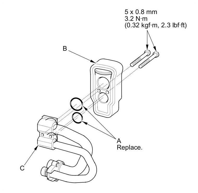 7. Remove the bolts, O-rings (A) and the expansion valve (B) from the inlet and outlet lines (C).