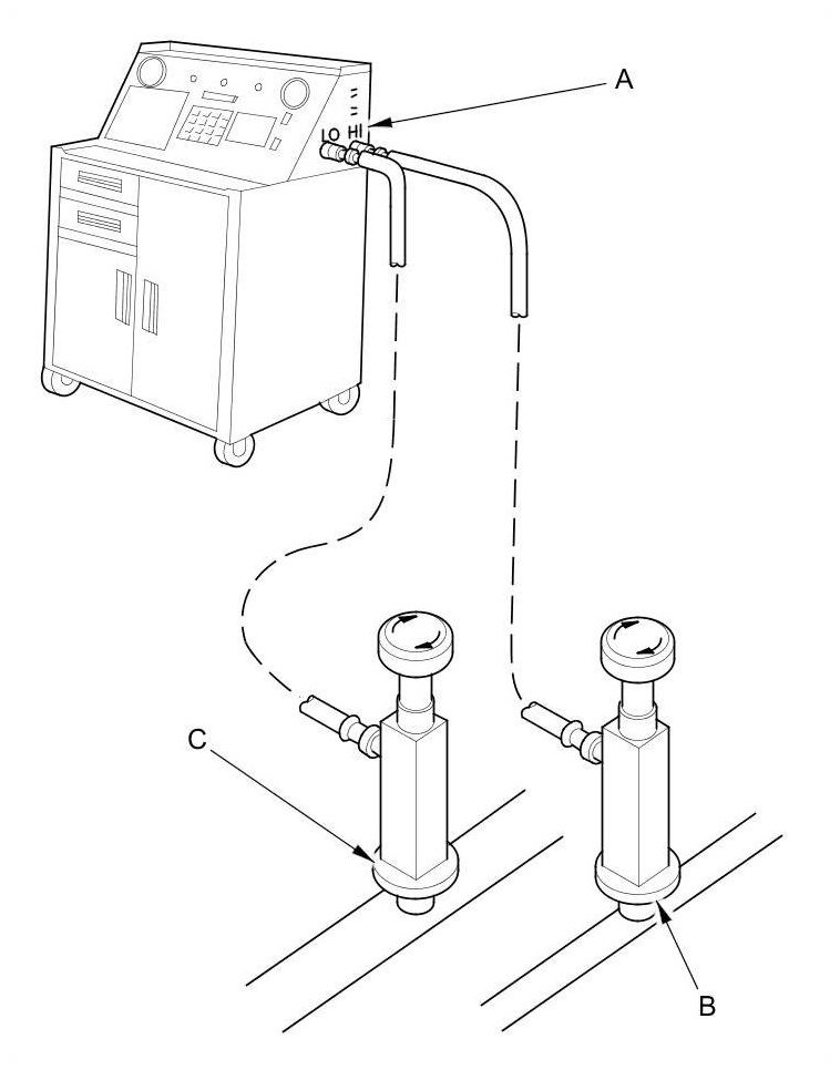 2. Connect an R-134a refrigerant recovery/recycling/charging station (A) to the high-pressure service port (B) and the low-pressure service port (C), as shown, following the equipment manufacturer's instructions.