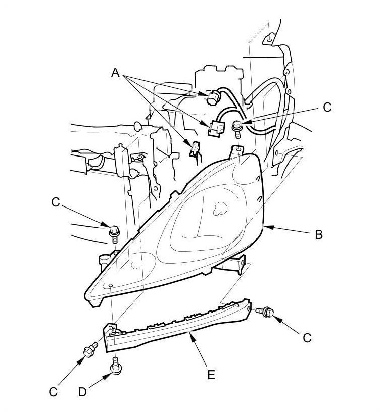 4. Remove the bolt (D) and the front bumper upper beam (E).