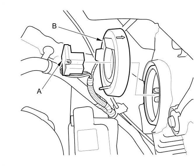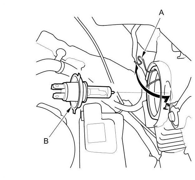 2. Pull the retaining spring (A) away from the bulb (B), then remove the bulb.