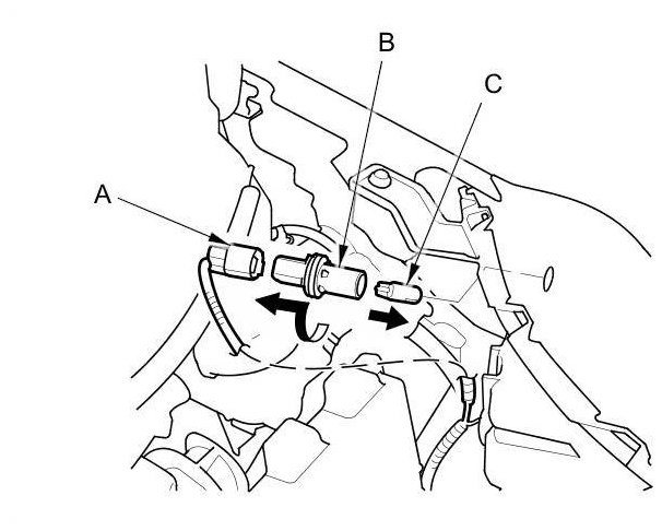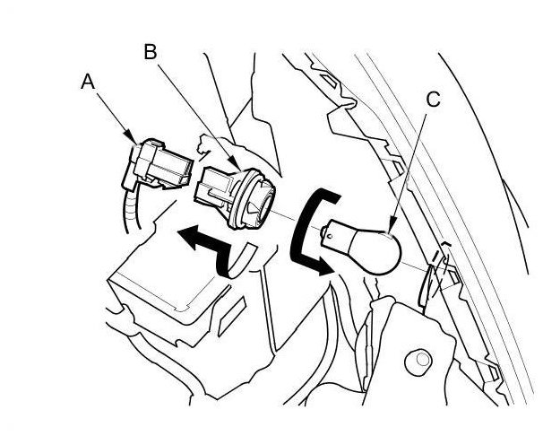 2. Turn the bulb socket (B) 45 ° counterclockwise to remove the bulb (C) from the headlight housing.