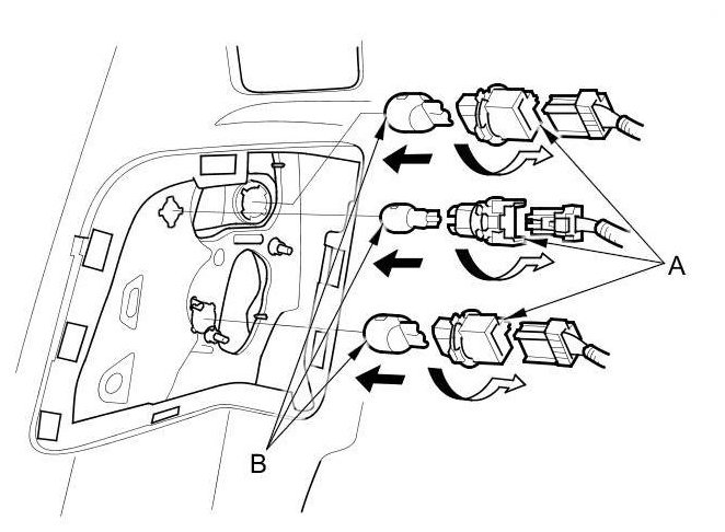 3. Turn the bulb socket (A) 45 ° counterclockwise to remove the bulb (B).