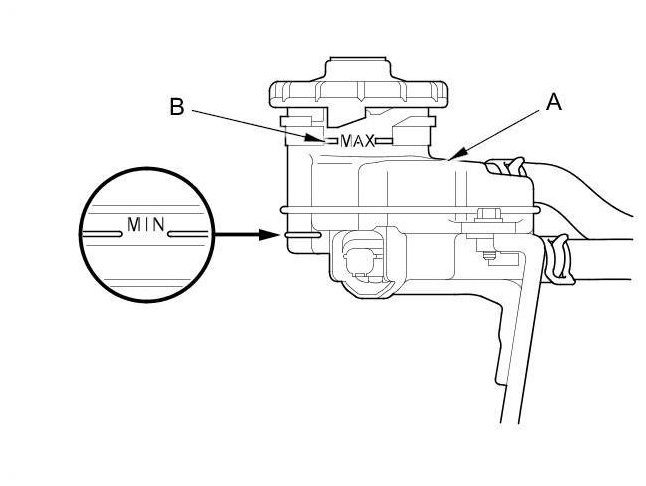 1. Make sure the brake fluid level in the reservoir (A) is at the MAX (upper) level line (B).