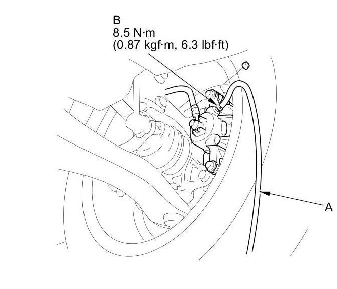 4. Attach a length of clear drain tube (A) to the bleed screw (B), then loosen the bleed screw to allow air to escape from the system. Then tighten the bleed screw securely.