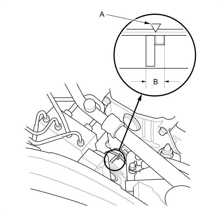 2. Check that the position of the auto-tensioner indicator (A) is within the standard range (B) as shown. If it is out of the standard range, replace the drive belt Service and Repair.