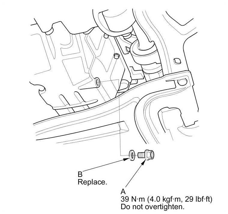 3. Reinstall the drain bolt with a new washer (B) and torque to specification.