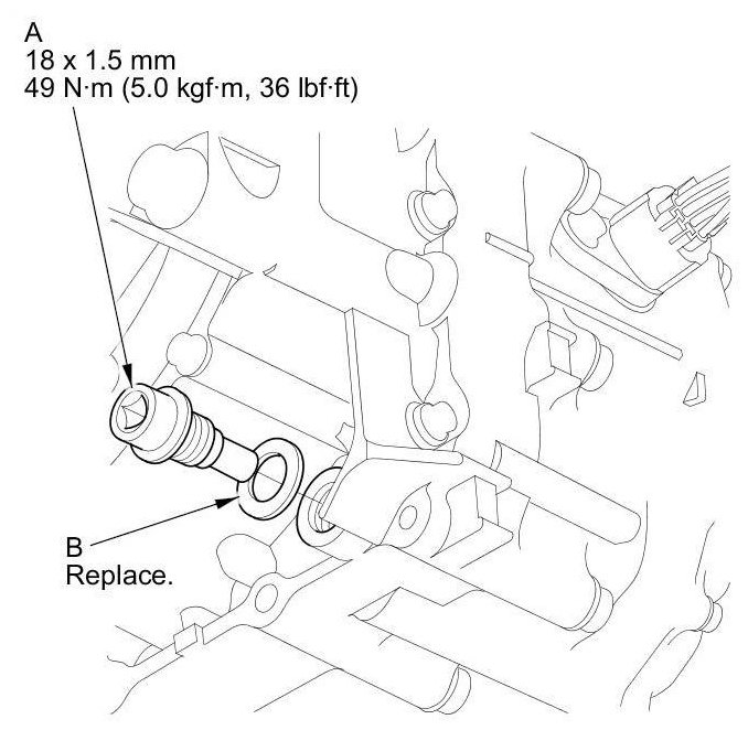 5. Reinstall the drain plug with a new sealing washer (B).