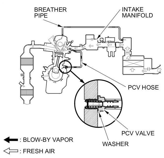 The PCV valve prevents blow-by gasses from escaping into the atmosphere by venting them into the intake manifold.