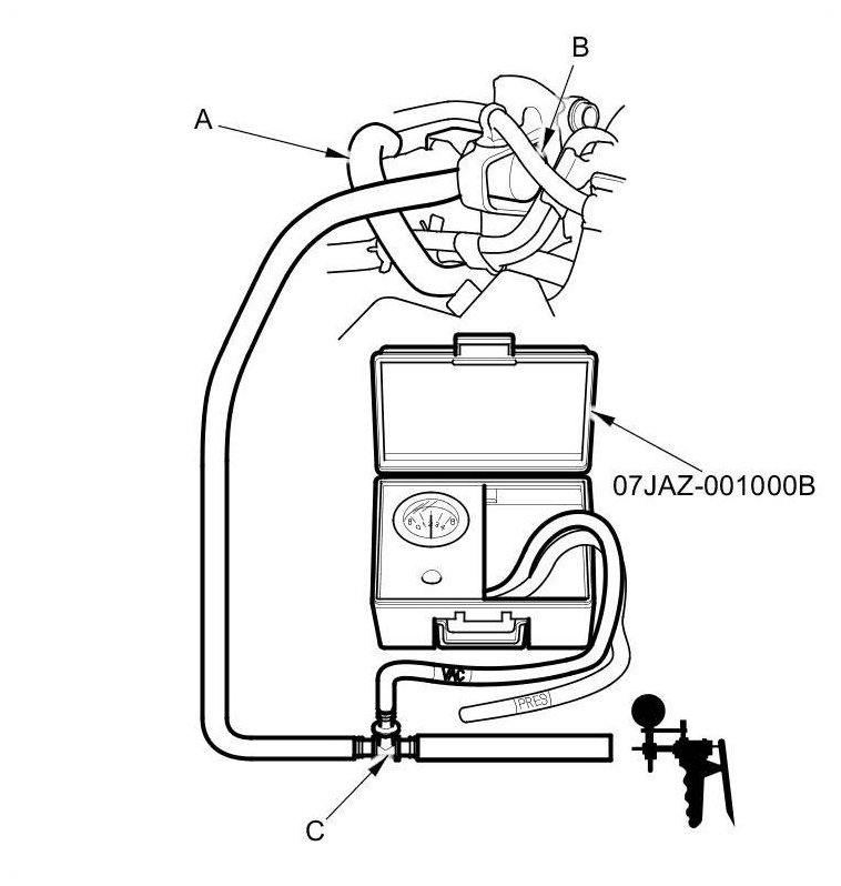 8. Disconnect the vacuum hose (purge line) (A) from the EVAP canister purge valve (B) in the engine compartment, then connect a T-fitting (C), a vacuum gauge, and a vacuum pump/gauge, 0-30 in.Hg, to the EVAP canister purge valve as shown.