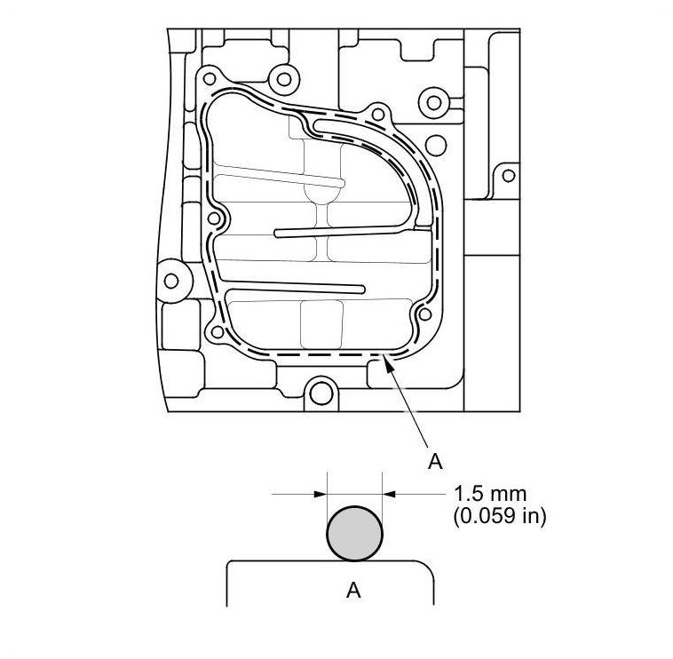 - Apply a 1.5 mm (0.059 in) diameter bread of liquid gasket along the broken line (A).